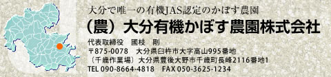 ![]() ![]() ![]() | ![]() ■会社概要 ●法人設立日/平成23年1月24日 ●組織形態/1戸1法人(役員1名) ●事業種類/有機かぼす栽培、農産物(赤しそ)の生産販売 ●資本金/300万円 ●経営規模/有機かぼす 5ヘクタール その他(赤シソなど) 0.5ヘクタール ●就業時間/夏期(4〜9月)8:00〜17:00 冬期(10〜3月)8:30〜17:00 ●休日/土・日・祝 ●雇用/社員3名、時期に応じてパートを雇用 ●福利厚生/社会保険・労災保険・雇用保険 |
